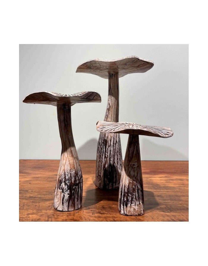 Trio de champignons décoratifs en bois naturel, sculpture artisanale au style organique, idéale pour une déco intérieure chaleureuse et contemporaine.