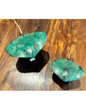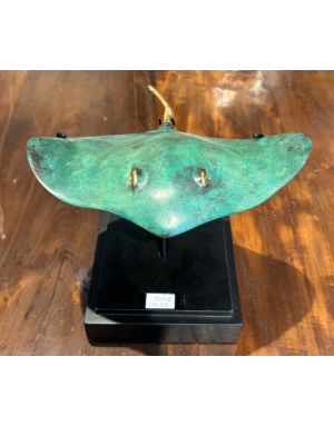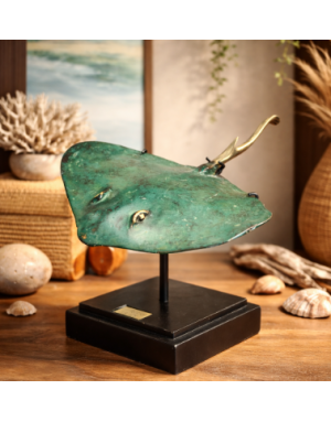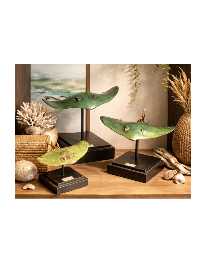 Sculpture décorative en laiton patiné, cette élégante raie s’inspire des fonds marins indonésiens, et plus précisément de l’île de Java. Sa patine vert profond, subtilement nuancée de touches dorées, évoque le passage du temps et l’oxydation naturelle au contact de l’air marin.