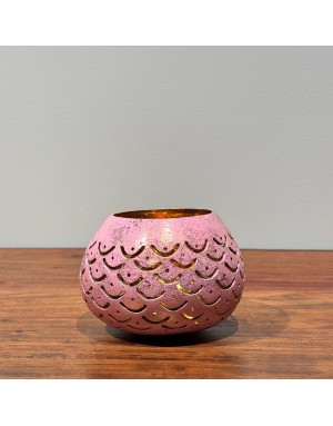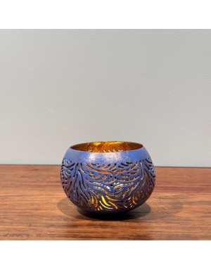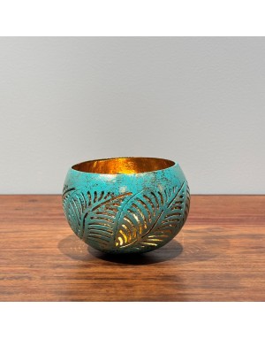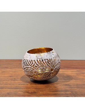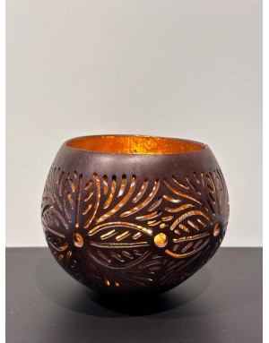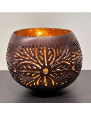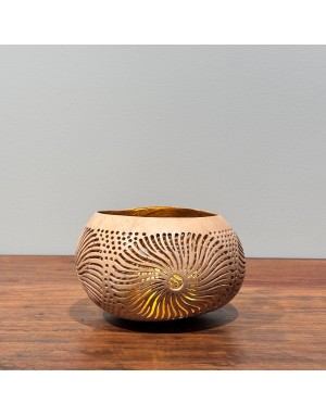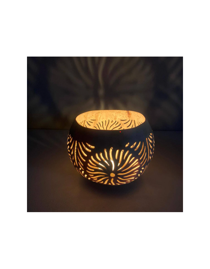 Photophore en noix de coco gravée et dorée – Élégance et lumière chaleureuse